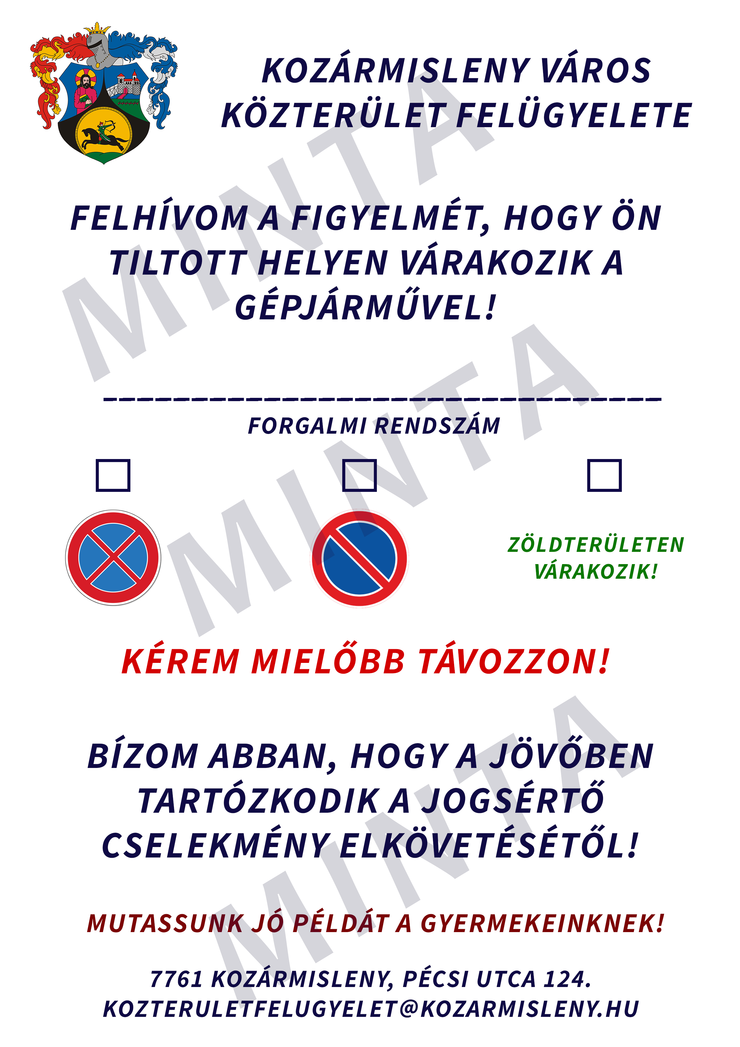 Kozármisleny Város Önkormányzata a közlekedési szempontból neuralgikus részeken megállást és várakozást tiltó táblák kihelyezésével eseti módon kezdte meg a közterületi parkolás visszaszorítását. Tájékoztatom, hogy a fenti jogszabályok betartását a közterület-felügyelet munkatársai ellenőrizni fogják, akik szabálytalan parkolás esetében eljárni kötelesek.