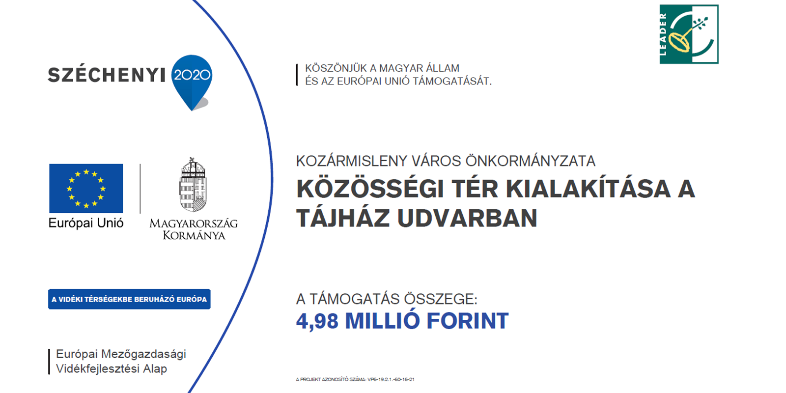 A Vidékfejlesztési Program keretén belül a(z) Mecsekvidék Helyi Közösség Egyesület működési területére meghirdetett, VP6-19.2.1.-60-16-21 kódszámú, Mecsekvidék Helyi Közösség Egyesület - Helyi fejlesztések támogatása című felhívás alapján Kozármisleny Város Önkormányzata, támogatási kérelmet nyújtott be, mely a projektenként maximum igényelhető 5 000 000 Ft-os keretösszegből 4 983 807 Ft támogatása jogosult. A Projekt fizikai befejezésének tervezett napja: 2022.12.31. A projekt célja a 7761 Kozármisleny, Petőfi Sándor utca 30. hrsz:477. alatti Tájház udvarának felújítása,az udvar rekonstrukciója- "Közösségi tér kialakítása a Tájház udvarban".